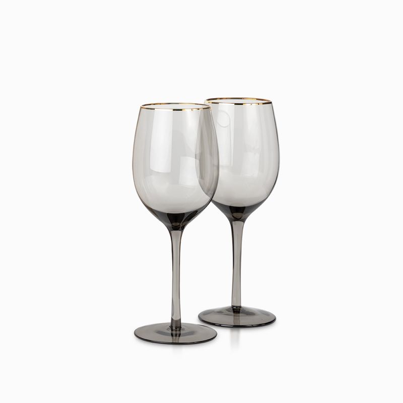 Set de dos copas line gris, especiales para servir vino tinto, su borde dorado evoca el brillo de los minerales extraídos de la naturaleza, al tiempo que rememora las clásicas copas y vasos de borde dorado, que en tiempos pasados eran sinónimo de lujo, gala y elegancia.