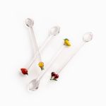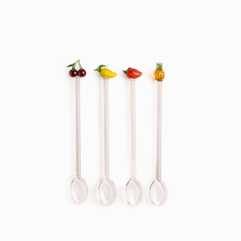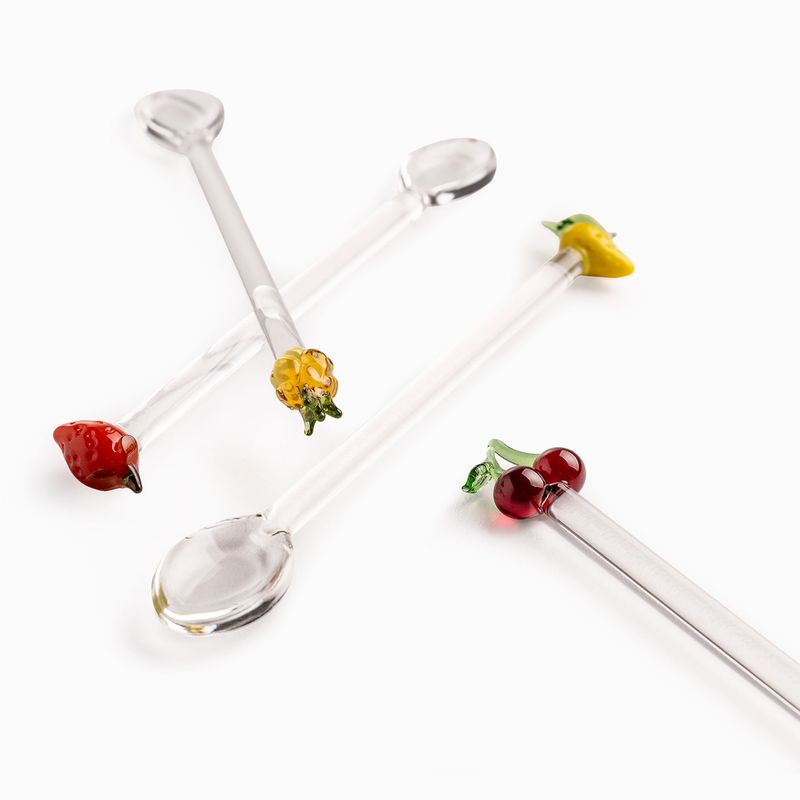 Cada cuchara cuenta con un delicado detalle de fruta en el extremo del mango (como cerezas, manzanas o limones), aportando un aire alegre, multicolor y sofisticado a tu mesa. Fabricadas íntegramente en vidrio borosilicato, un material premium que destaca por su transparencia cristalina, ligereza y alta resistencia a cambios de temperatura. Con un largo de 15 cm, son el tamaño ideal para acompañar postres, tazas de té, cafés de especialidad o para servir mermeladas y salsas dulces.