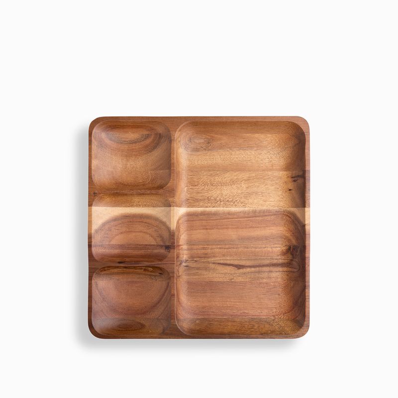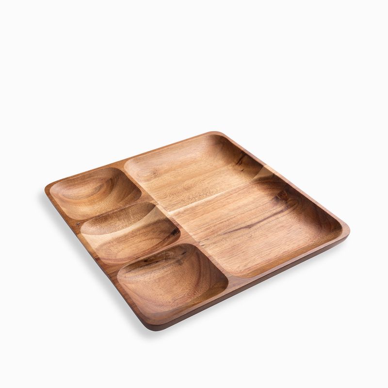 Presenta tus aperitivos con una tabla natural de madera. Dile adiós a los platos desorganizados donde los sabores se mezclan, con sus cuatro divisiones esta no pasará. Esta pieza de acacia es la solución ideal para ofrecer una variedad de snacks con elegancia rústica y orden. Esta pieza es terminada a mano y conserva las vetas de la madera, por tanto, cada referencia es única y presenta tonalidades diferentes.